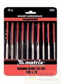 Набор надфилей алмазных 140х70х3, 10 шт.// MATRIX MASTER (15835)Надфили с напылением из алмазной крошки применяются для мелких слесарных работ с особо твердыми материалами: металлом, керамической плиткой, стеклом и др. Длина рабочей поверхности надфилей – 70 мм. В набор арт. 15833 входят надфили с треугольным, прямоугольным, круглым, квадратным, полукруглым сечением. В набор арт. 15834 входят надфили с треугольным (2 шт.), прямоугольным, круглым, квадратным и полукруглым сечением. В набор арт. 15835 входят надфили с треугольным (3 вида), прямоугольным (2 вида), круглым, квадратным, овальным (2 вида) и полукруглым сечением. Изделия имеют удобные пластмассовые рукоятки.